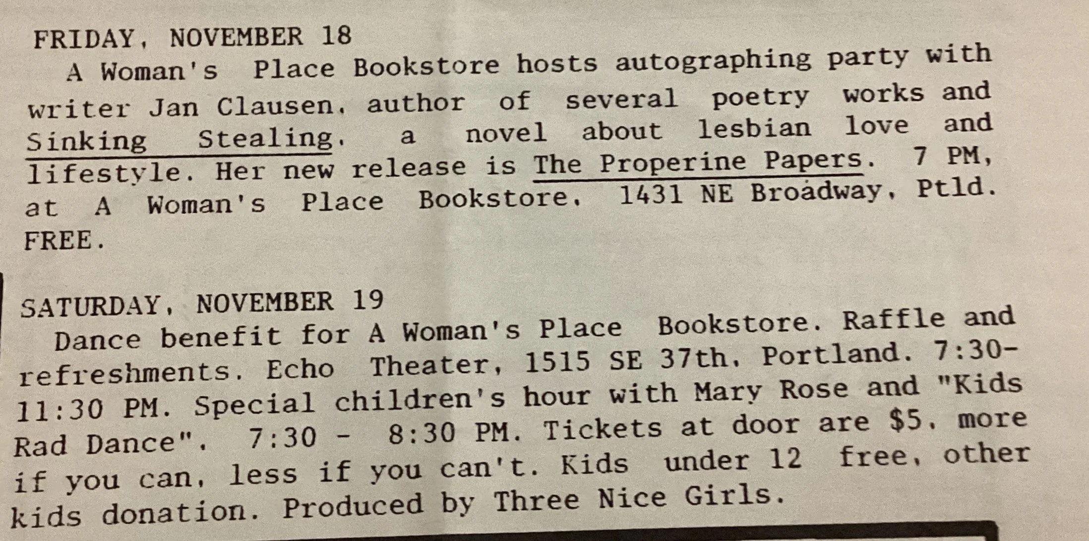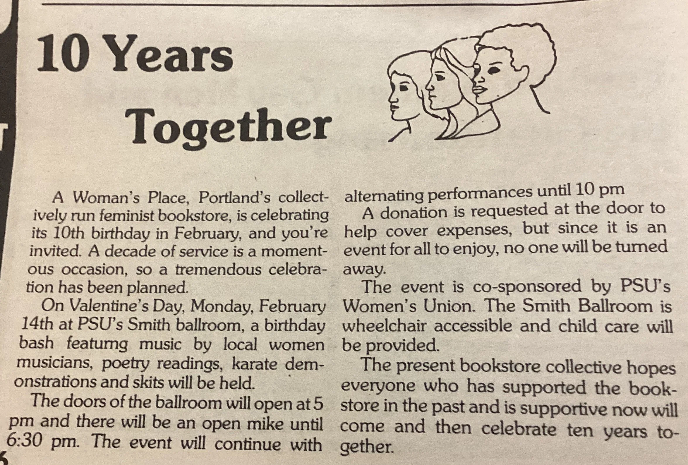·In the City Open Press, February 14-March 13, 1986, page 12 “A WOMEN’S PLACE” For Thirteen Years Portland’s only non-profit feminist bookstore, A Woman’s Place, is celebrating its 13th year in business…at 2349 SE Ankeny. [partial article]