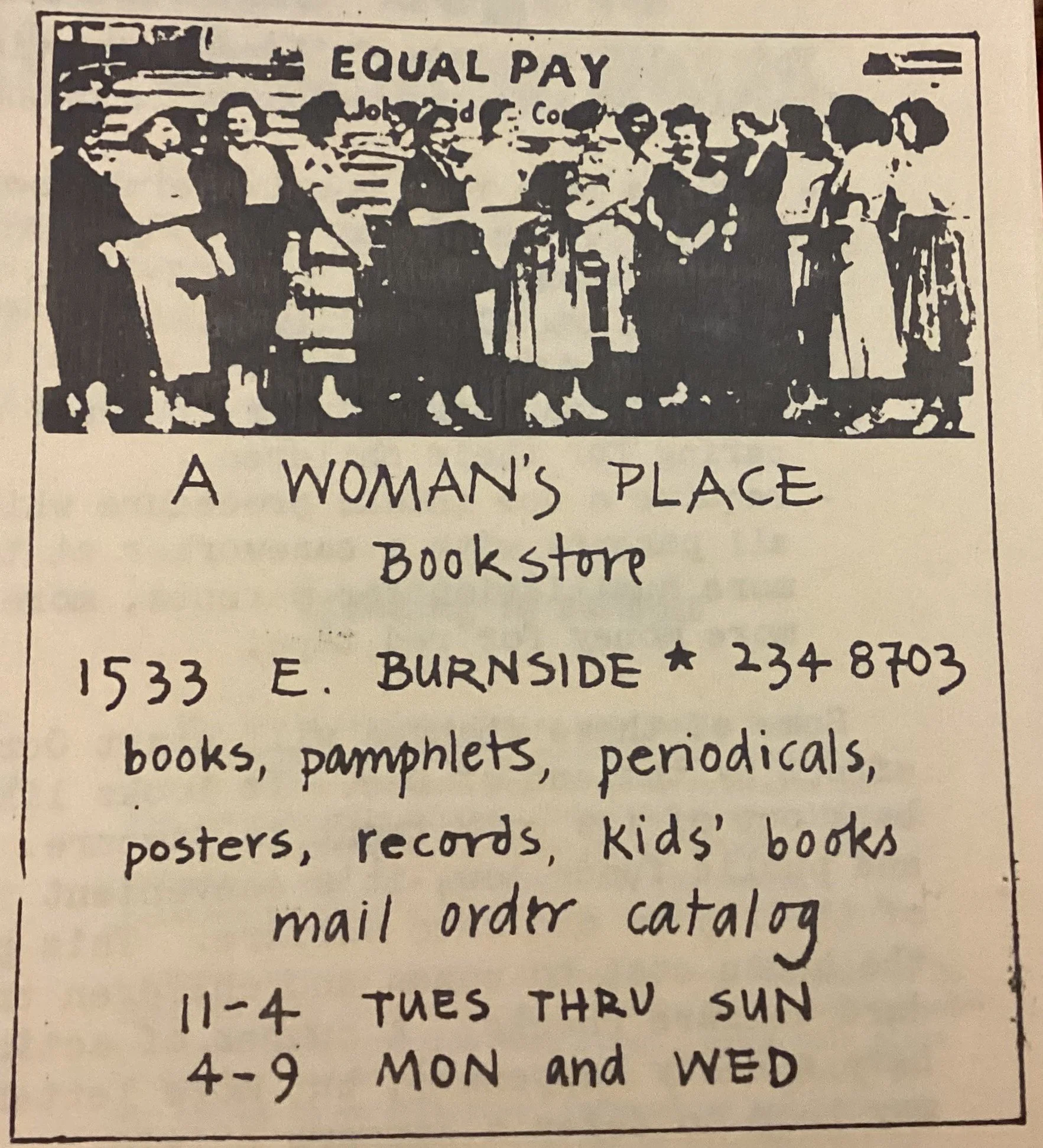 ·In the December 3, 1982, issue of Cascade Voice page 17 an article about the store: “A Woman’s Place Bookstore, located at 2349 SE Ankeny, has been providing a wide variety of services to the women’s community of Portland for the past 10 years. The bookstore is a non-profit and collectively run, meaning that a small group women make decisions on how the bookstore should be managed, based on a majority vote. The only paid staff member is the manager who coordinates and supervises the other volunteer staff members. Selection of women’s books, albums, posters, and other items that are offered for sale. Currently they are also stocking Gay men’s books and albums referrals and is to provide free information, referrals and help to women in crisis situations. Bulletin boards are provided for women to post requests for roommates, housing, jobs, rides, and any other reasonable request. A Woman’s Professional Board is provided for women to post business cards.