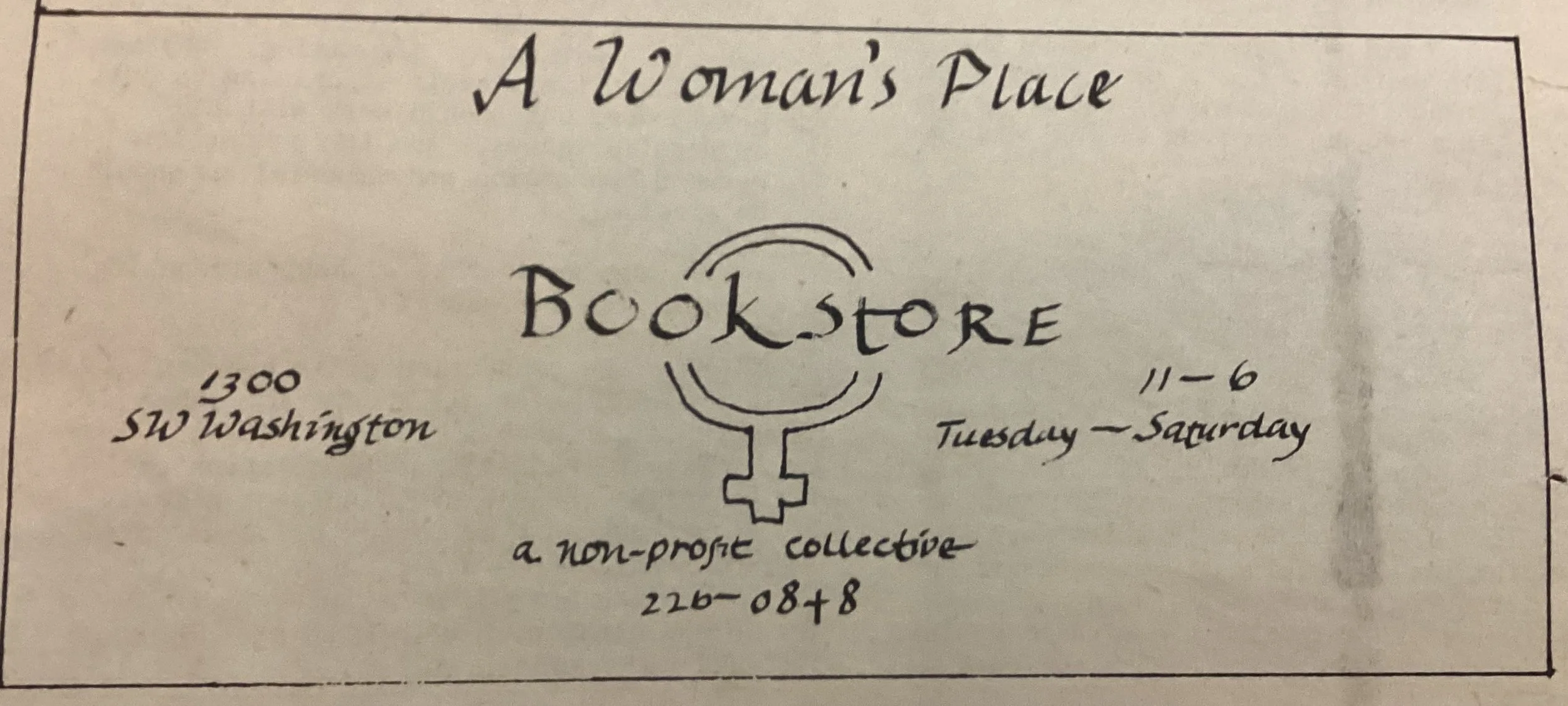 ·Listed in Damron Address Book/Address Guide 1978 under Book Store with notation G – Ladies or Ms. And with a different address: 1533 E Burnside Street and it states Woman’s Place not “A” with note: (Book Store)
