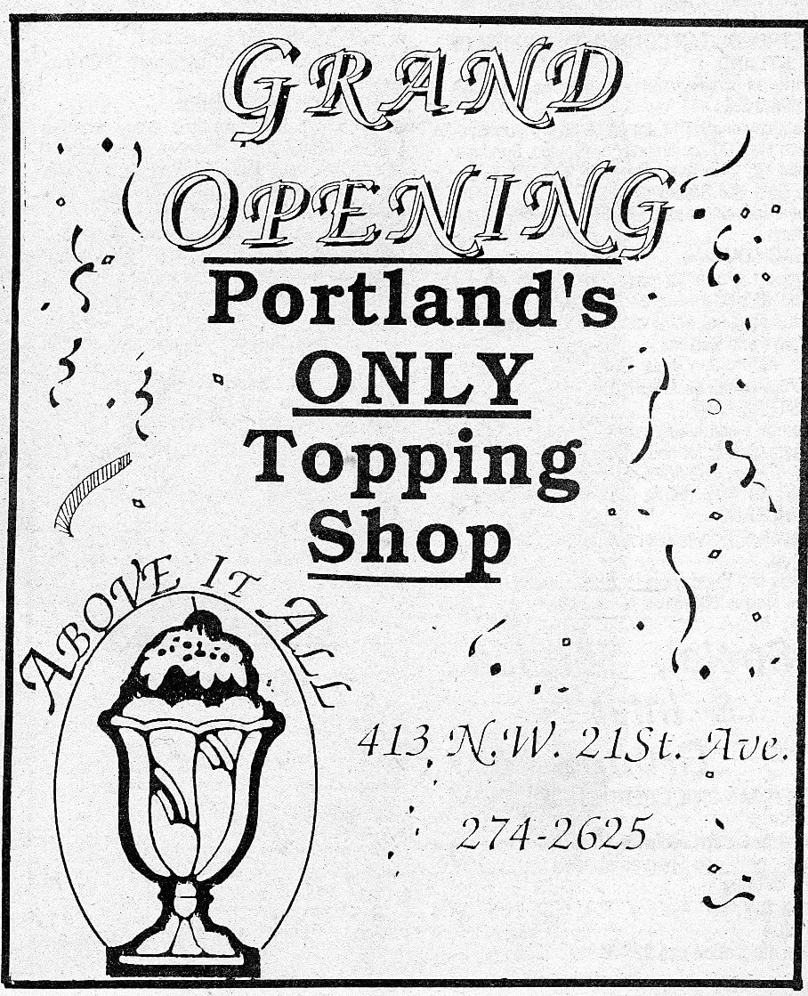 Per ad in the Oregon Gay News – City Week newspaper Wed. April 6, 1988 “GRAND OPENING PORTLAND’S ONLY TOPPING SHOP”