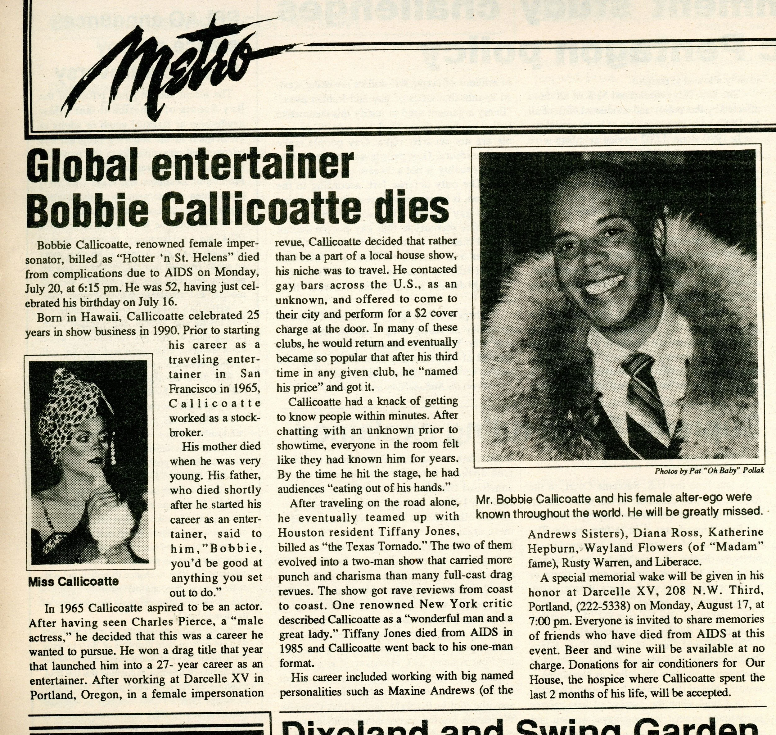 His last few months were spent at Our House, an AIDS hospice house in Portland, Oregon. Bobbie died in a Portland hospital of pneumonia arising from acquired immune deficiency syndrome on Monday, July 20, at 6:15 pm. He was 52, having just celebrated his birthday on July 16. His obituary stated and was misrepresented that he had worked with Carol Channing, Diana Ross, and Katherin Hepburn when it actually was that those were the people he immolated with this drag performing. He did possibly meet through Maxine Andrews [The Andrew Sisters] because she performed at Darcelle XV Showplace twice, and he did work with Wayland Flowers and Madame as that act performed as part of the shows at the Madeira Room.