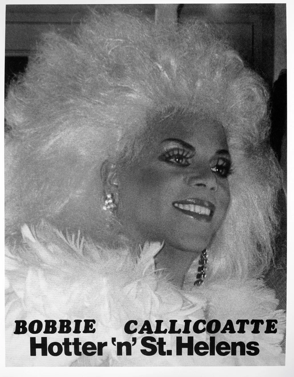 He began touring and then came to Portland and worked at Darcelle XV Showplace until he got restless and performed as a solo act until he teamed up with Tiffany Jones the wisecracking, lip-synching drag queen from Texas. Tiffany would open her act with, "I see we have a number of straight people in the audience today. I love straight people; they're so obvious!" She performed in Provincetown in the late '70s and early '80s. Tiffany would spinning like a top to the strains of Ain't No Mountain High Enough or doing his trademark roller-skating nun, and his signature closing was Charles Aznavour's lovely balled, Tell Me if You Can, What Makes a Man a Man, which defiantly confronts hostility and discrimination against gay people. Resplendent in drag, Tiffany would elegantly remove one thing at a time until he was in his bikini briefs. Then he would throw on a pair of old jeans, boots, and a cowboy hat, now the picture of masculinity, and crumple his wig in his hand while looking heavenward. That number elevated a cheap and funny drag show to something approaching art. When Tiffany died in 1985, Bobbi went back to a one-person format.