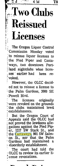 In Phil Sanford’s book, Rose City Vice, Portland in the 70s he writes, “Jerry remembers walking into the Castaways a bar downtown at 901 SW Salmon… …around 1971…The Castaways was one of those old-time bars that was below street level, so you had to step down about three steps to enter…”