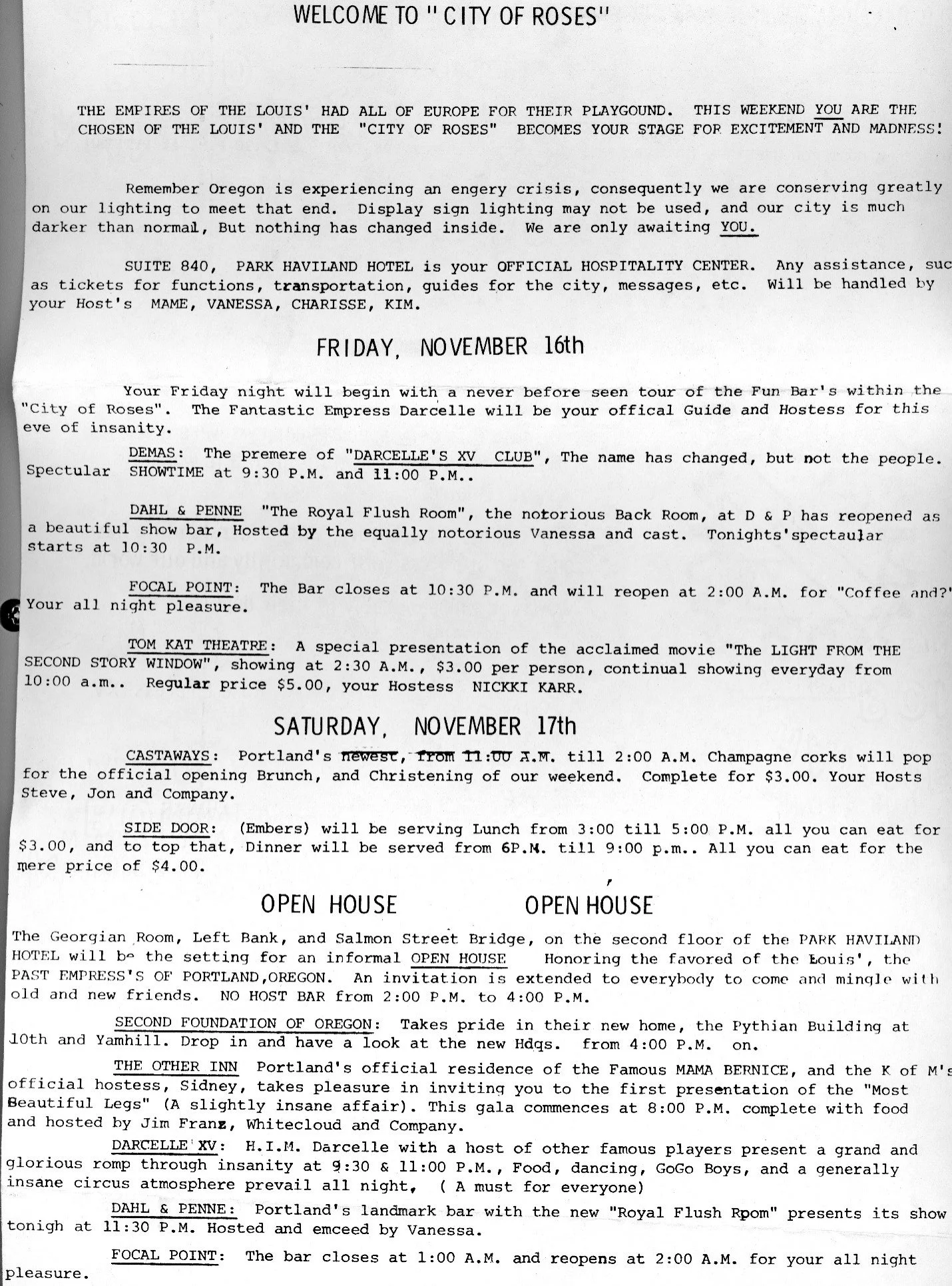 1974, November 16-18th, Walter W Cole/Darcelle Empress XV was hosting her step down and the crowning of Empress XVI who would be Doni Lame’. A sheet was developed entitled WELCOME TO “CITY OF ROSES” with various details. Three mentions for Castaways “Saturday, November 17th. CASTAWAYS: Portland’s newest, from 11:00 am till 2:00 am Champagne corks will pop in for the official opening brunch and Christening of our weekend. Complete for $3.00. Your hosts Steve, Jon, and Company.” The other was CASTAWAYS 11:00 am – 2:30 AM Corner 9th & Salmon 248-0075 AND “Sunday, November 18th CORONATION ’74 ‘Meet the newly crowned ROSE EMPRESS XVI tonight at the CASTAWAYS after the CORONATION till 2:30 am.”