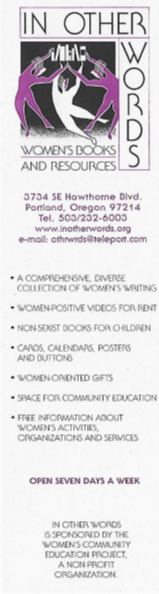 Per https://www.autostraddle.com/alex-nguyen-city-guide-portland-oregon-133237/ [2012] In Other Words is a non-profit feminist bookstore located in North Portland and setting for the popular bookstore skits on Portlandia. They host a poetry night called Dirty Queer, supply the local colleges with gender studies textbooks, and host many other community events. They are also the location and inspiration for the Feminist Bookstore seen in the series Portlandia.