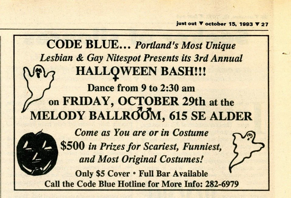 Below is an ad for CODE BLUE ad in Just Out on October 15, 1993.