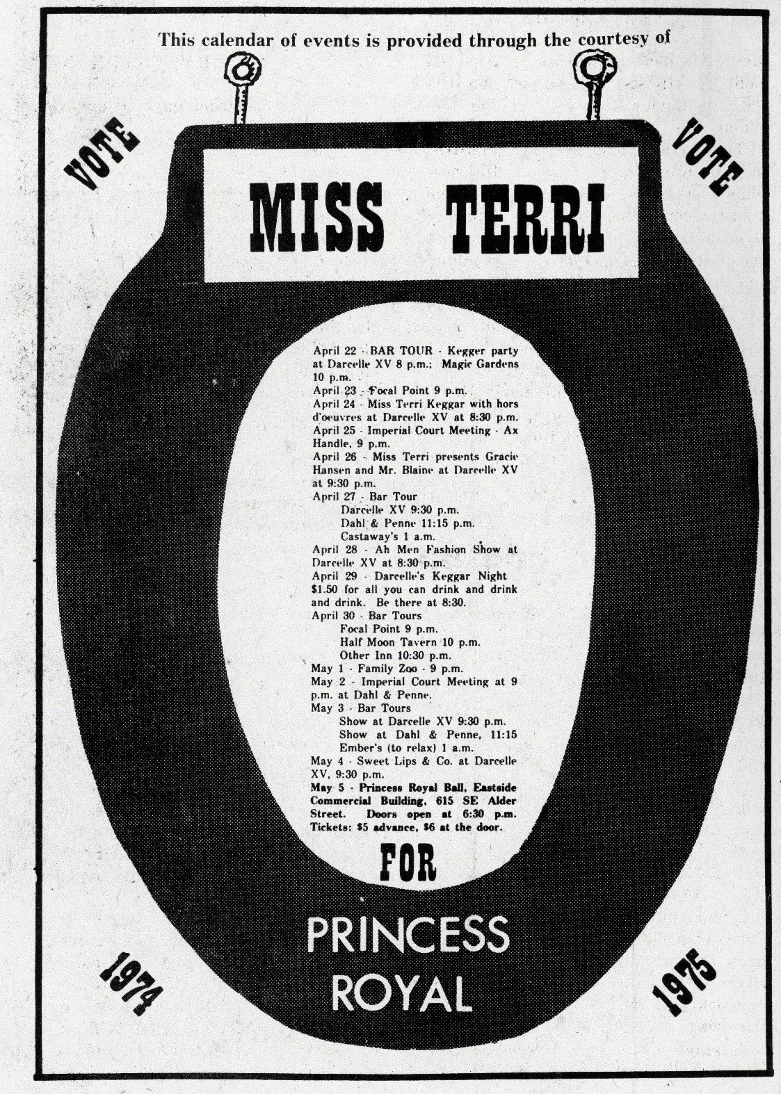 In August 1974 The Golden Awards second ceremony was held on August 25 at the East Side Commercial Building located at 615 SE Alder where, after leaving the Pythian Building some of what was the Portland Gay Community Center moved to. See Awards Golden Awards.