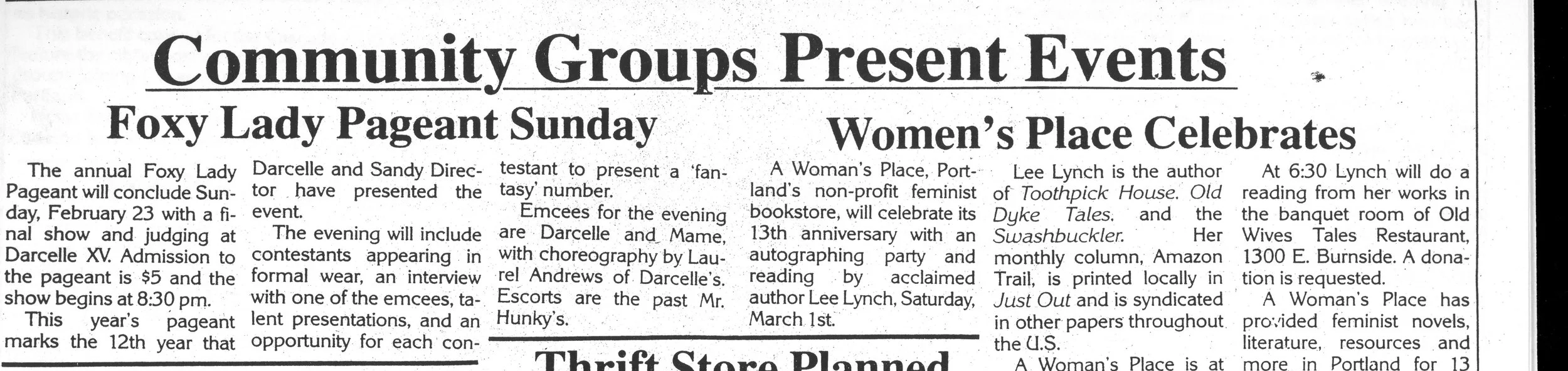 Per Northwest Gay Review, page 10, June/July 1977, “Sandy Director…originated the Mr. Hunky and Foxy Lady contests as a tribute to the gay community’s generous response to his need for the large blood transfusions a few years ago. All of these events have a serious motive urgency of contributing blood to the Red Cross. One of the requirements of the winners of the Mr. Hunky and Foxy Lady contests is that they organization.” Below is an article in the January 1976 issue of NW Gay Review, “It’s Foxy Lady time again.”