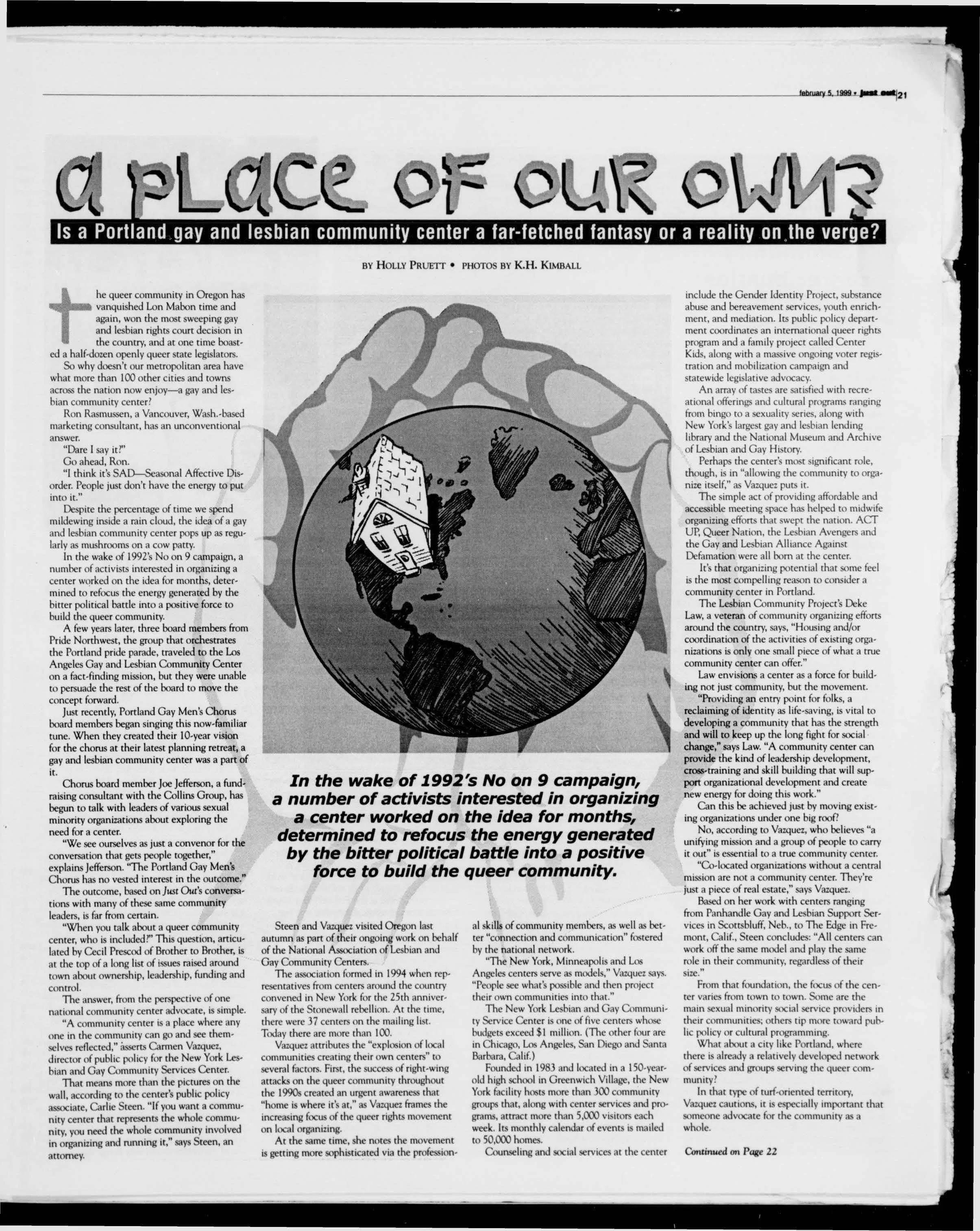 After the closure of the community center at the Pythian Building in 1974, there was a call for another one in the Just Out Newspaper, on February 5, 1999. [See Below] Before that, Per notes by David Grant Kohl author of A Curious and Peculiar People “The Lesbian Community Project which had members of approximately 600 had a goal that in October 1987 that they, in one year would establish a Community Center.” Through extensive research, there is no evidence of a community center between the demise of the Portland Gay Community Center in 1974 and the Q Center in 2006.