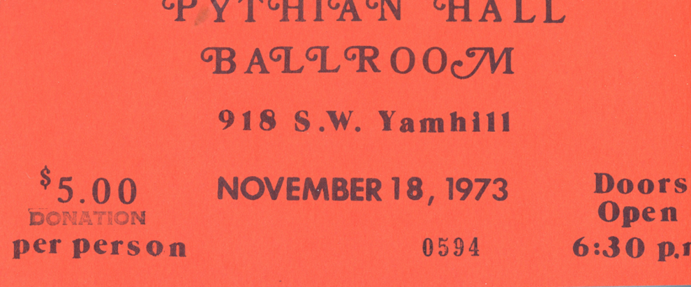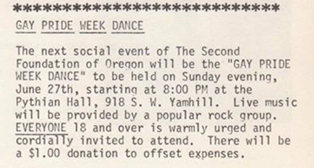 Per the Northwest Gay Review, page 16 Capital Failure, February 1974 “This is the site of the first Gay and Lesbian Pride celebration, coinciding with the second anniversary of the Stonewall Rebellion. The event, sponsored by the Second Foundation of Oregon, featured a rock band and same-sex dancing. Two hundred reportedly attended the dance in the upstairs ballroom. The Second Foundation later moved its offices to this building from 258 S.W. Alder but were forced to close them after its treasurer absconded with several thousand dollars needed to pay the rent.”