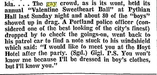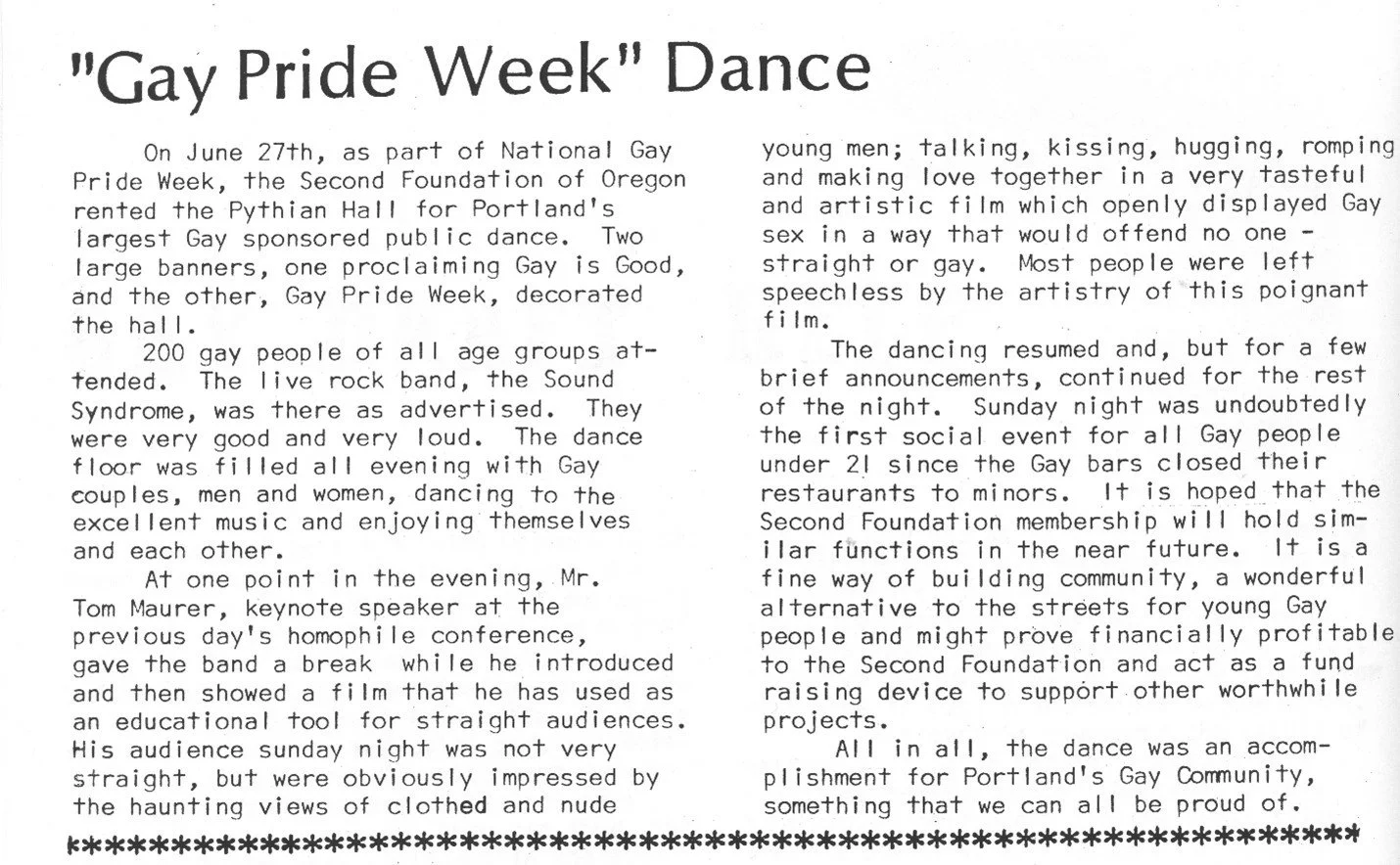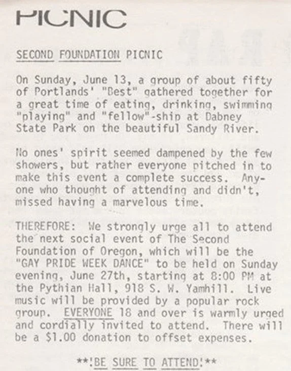 Below: In the August 1971 issue of The Fountain, page 18 there is an article GAY PRIDE WEEK. See Gay Pride. Another event took place and that was the Debutante Ball 1972. See Organizations Imperial Rose Court of Portland Court System 1972
