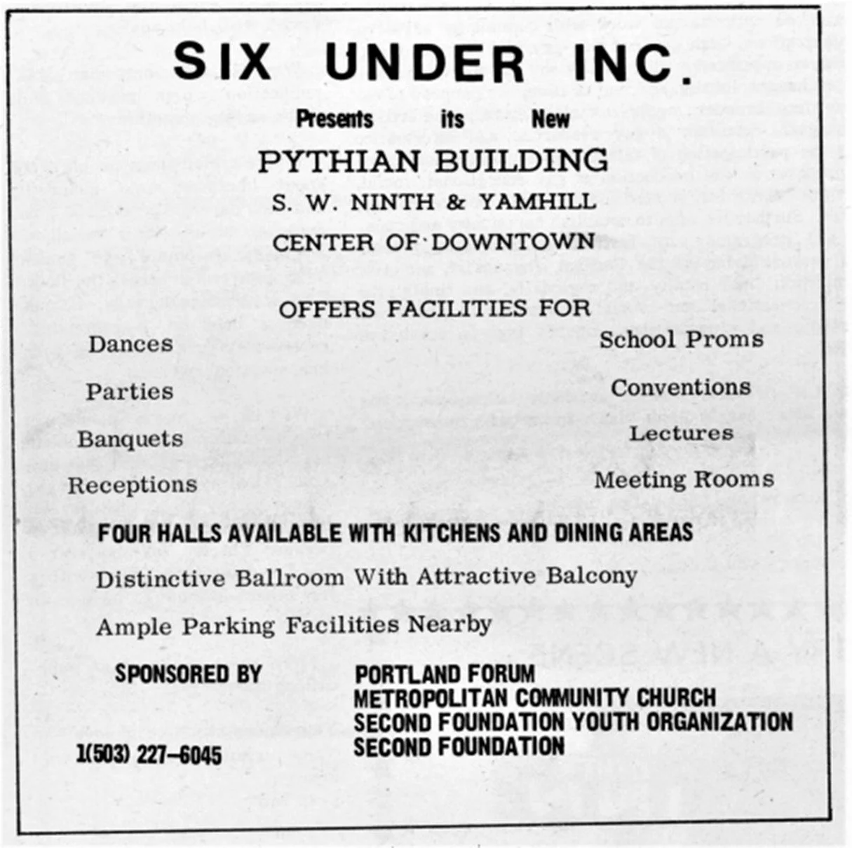 By July 1973 the headline read “FOUNDATION OFFICER ACCUSED OF EMBEZZLEMENT” [The Fountain]. The Second Foundation of Oregon largest gay organization in the Pacific Northwest, found itself in deep trouble last month with up to $3,000 missing and a president who suddenly skipped town. By November a group was formed Six Under Inc. This was a group formed that sold ‘stock’ into the organization. Groups expressed interest in the complex: Second Foundation, the Portland Forum, Second Foundation Youth Alliance, Metropolitan Community Church, the list was long. Below is a notice in the Northwest Gay Review, November 1973.