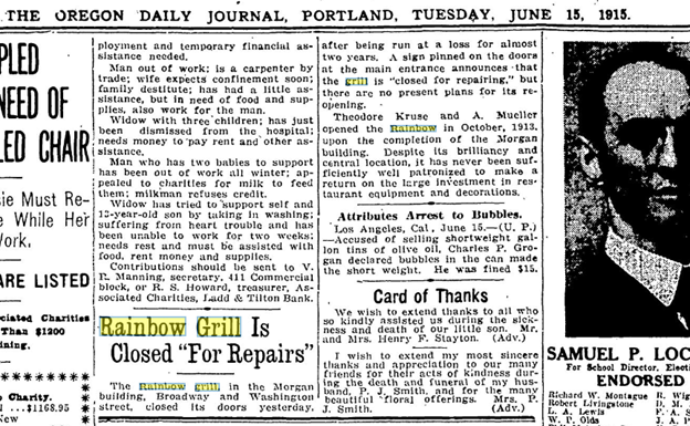 The Morgan was home to Theodore Kruse's Rainbow Grill, which opened in October 1913. Kruse had closed his Louvre restaurant, a hotspot in the gay community, after it was a focal point of the 1912 Portland vice scandal. The Rainbow advertised "fat, juicy, delicious" oysters and a "Special Men's Grill" with meat of the diner's choosing. It closed in June 1915.[4][5]