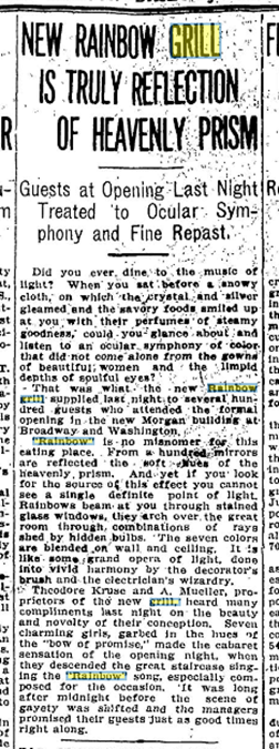 Story: Per GLAPN website: After closing the Louvre, Theodore Kruse opened the Rainbow Grill in the Morgan Building. It was so named because its design with prisms set throughout spread arrays of color all about. The Rainbow was described as a place of unsurpassed otherworldly beauty that took a beholder’s breath away. Like the Louvre, the Rainbow had a separate grill just for men. Unlike with the Louvre, Kruse was not able to sustain the Rainbow financially, and he filed for bankruptcy in June 1915, after only a few months of operation.