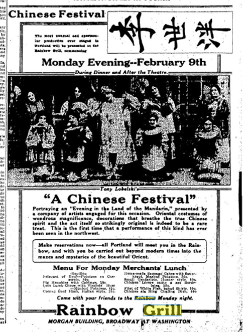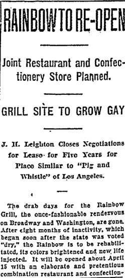 Below is the announcement of The Rainbow Grill Oregon Journal September 28, 1913.