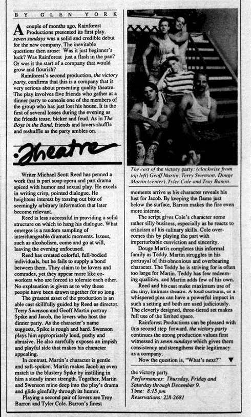 In the Just Out October 1989 issue in the Out about Town section, page 18 Thursday, 12th Michael Scott Reed’s The victory party explores the intertwining friendships, partnerships, and flirtations of five men. This play featuring Terry Swenson, Geoff Martin, Douge Martin, Tyler Cole, and Troy Baron is produced by Rainforest Productions.