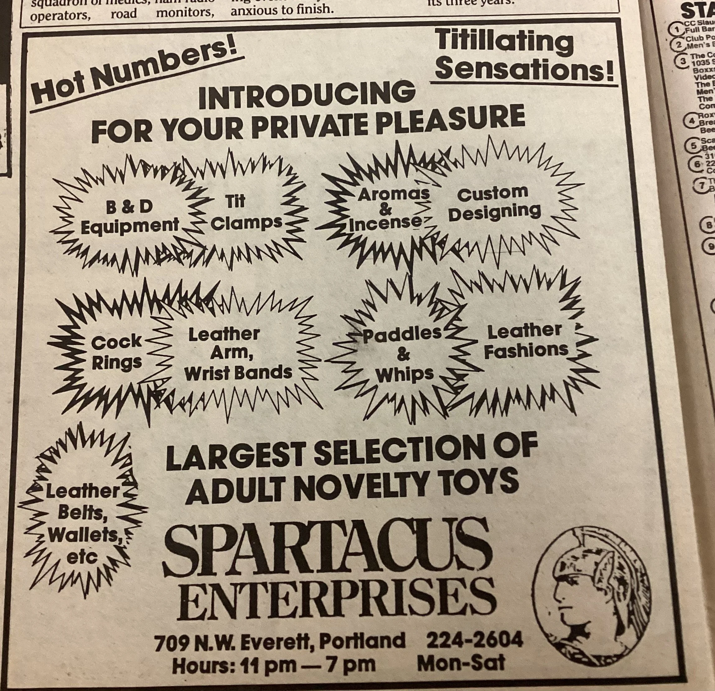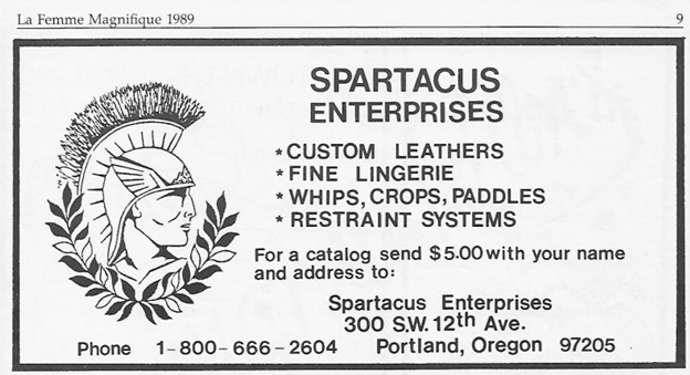 Per Oregon Leather History Timeline, page 30 July 27, 1989, Willamette Week (newspaper) names Spartacus as “Best Leather, Kinky Clothing and Adult Toy Store” in its “Best of Portland” issue and pictures Lizzy Black on the front cover.