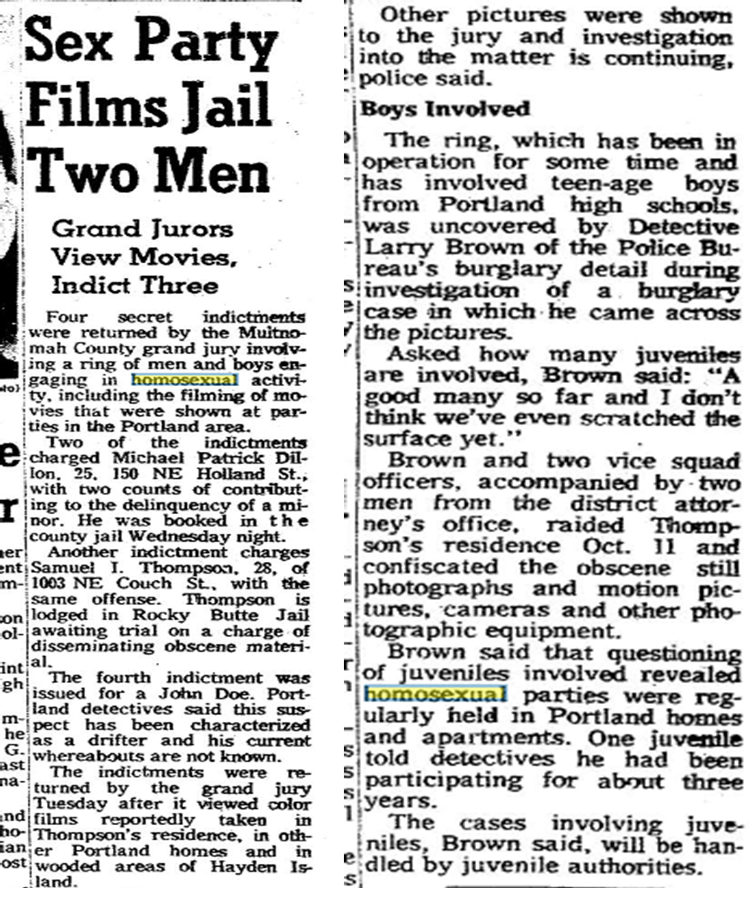 Per Sister Paula Nielsen in her book “The Trans-Evangelist, page 98, “In the mid 1950’s, there was a notorious bar, the Harbor Club on SW 2nd Avenue & Yamhill Street. The Harbor Club housed a street level restaurant and bar which catered to straights and gays, while upstairs was a bar frequented exclusively by gays at nighttime…Harbor Club was off limits to soldiers and sailors. Nearby was a tavern at SW 1st Ave & Morrison St, The Half Moon. [Page 123] in the late 1950’s, I hung out at the Harbor Club and the [Half Moon Tavern. During the city’s annual Rose Festival celebration, several Navy ships docked at Portland’s waterfront. The Half Moon would be jam packed with Canadian sailors. Sometimes military men would patronize the Harbor Club in civilian clothes. / 5 Most of the military men went to gay bars to find sexual encounters. However, a few would lure gay men away from the bar, their buddies waiting outside to rob them and sometimes beat them up. In those days, there was a strong bond between masculine women and effeminate men. Many of them hung out at the Harbor Club, forming strong friendship bonds. It was there that I met a lesbian couple, Jacki and Esther. Jacki (the “e” was intentionally left off the end of her name) was the butch (masculine) partnering their relationship. On page 185”1973, Portland had more than just two gay bars where homosexuals could be open. Besides the bar scene, other I munity activities for gays and lesbians were forming. While conservative as it was in the 1950’s, Portland was still on its way to becoming a progressive city. The old gay hangout, the Harbor Club, was no longer Since its closure in 1965, many other bars catering to gays had come into play.”