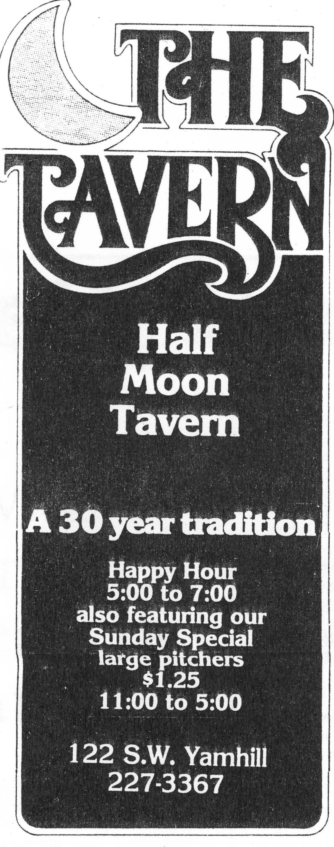History: It was owned by Eugene Kennedy and his son, Les. In November 1960, The Half Moon Tavern was moved to 122 S.W. Yamhill, where it continued under the Kennedys’ ownership until 1975. [Duane Frye recalls working there as a bartender before moving to its later location on Yamhill in 1974 per ad in NW Fountain (see below)]. Ray Wilston became owner in 1975 and in an ad in the NW Fountain it states, “celebrating three years of ownership …waterhole of 20 years.” located on Front Street right at the Morrison Bridge approach. The building was torn down, and a hotel was erected in its place, presently it’s the River Side Inn). Photo BELOW is from Northwest Gay Review page 14 June 1977.