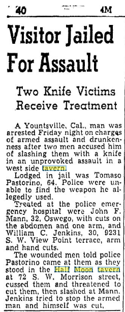 This was one of the bars singled out in the tavern licensing controversy of 1964-65 (Oregonian, Nov. 28, 1964, p. 11), and contemporary vice reports are quite hilarious to read years later, noting how one particularly good-looking vice officer “got a pat on the behind” while undercover here. It is unclear when the gay history of the Half Moon began. There is an article in the Oregonian concerning two male patrons slashed by a visitor in an “unprovoked attack,” Oct. 19, 1952, p. 50. Sophia Cereghino, owner of the Half Moon beginning in 1939, died in 1955. It isn’t known whether the gay nature of the place began with new owners after her death or was in place during her lifetime. In November 1960,