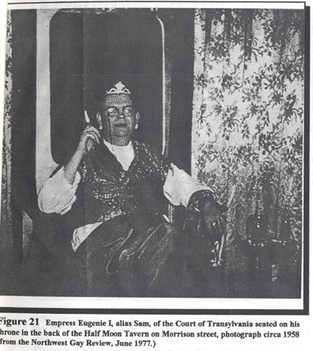 Sometime around 1958 (or ’59? - nobody seems to know for sure)—the first Queen Eugenie I (alias Sam) was self-proclaimed in the Court of Transylvania. This mythical court allowed for a whole plethora of other regal titles to come about including a Lord High Sheriff, and a number of other drag queens including Sr. Mary Wanna (Michael Patrick Dillon, who later got caught in a 1963‑1964 sex scandal; see the Oregonian, Oct. 25, 1963, p. 26; Mar. 25, 1964, p. 13). In the back of the bar was erected a throne for the Queen (who would later become known as Empresses). An unbroken line of succession was created to the present day—with the earliest Empresses declared by someone (but who knows who?), and later by community-wide elections held in the city’s bars. Beka Smith, Portland State University