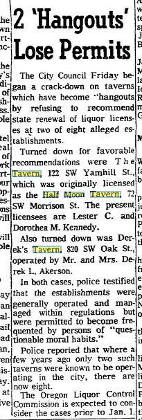 City of Portland Directory, page 230, 1964 – Half Moon Tavern located at 122 SW Yamhill