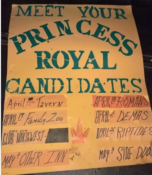 A yearly Ball which selected an Empress added still another rite: A Spring Spree which would select a Princess Royal or backup Empress. The banner below hangs at Darcelle XV Showplace backstage photo taken 2022.