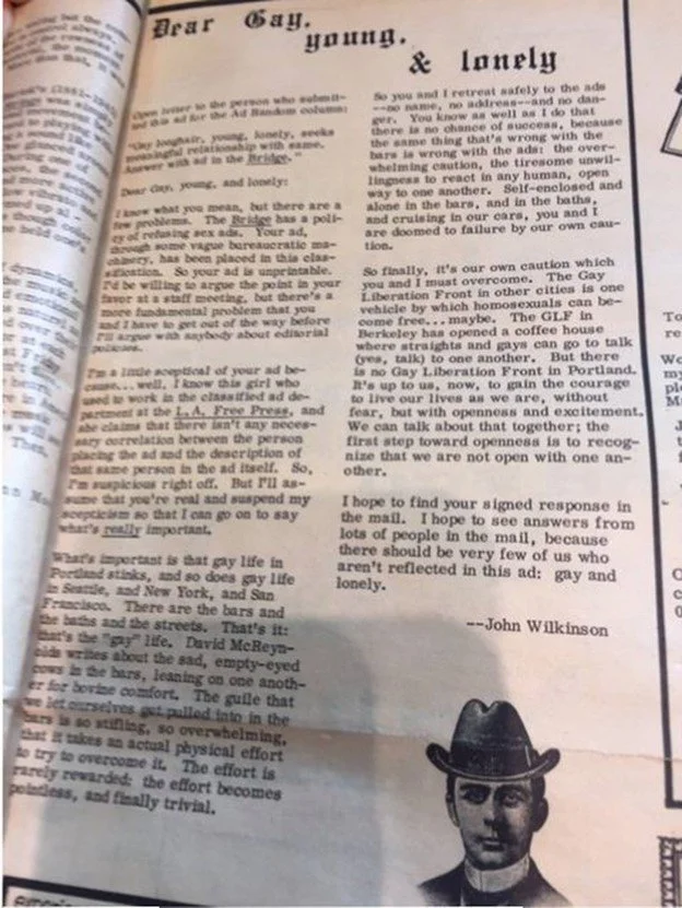 How a Classified Ad in an Underground Newspaper Ignited Portland’s LGBTQ Rights Movement (wweek.com) https://www.wweek.com/culture/2019/06/12/how-a-classified-ad-in-an-underground-newspaper-ignited-portlands-lgbtq-rights-movement/